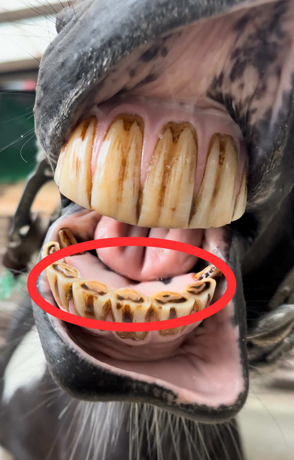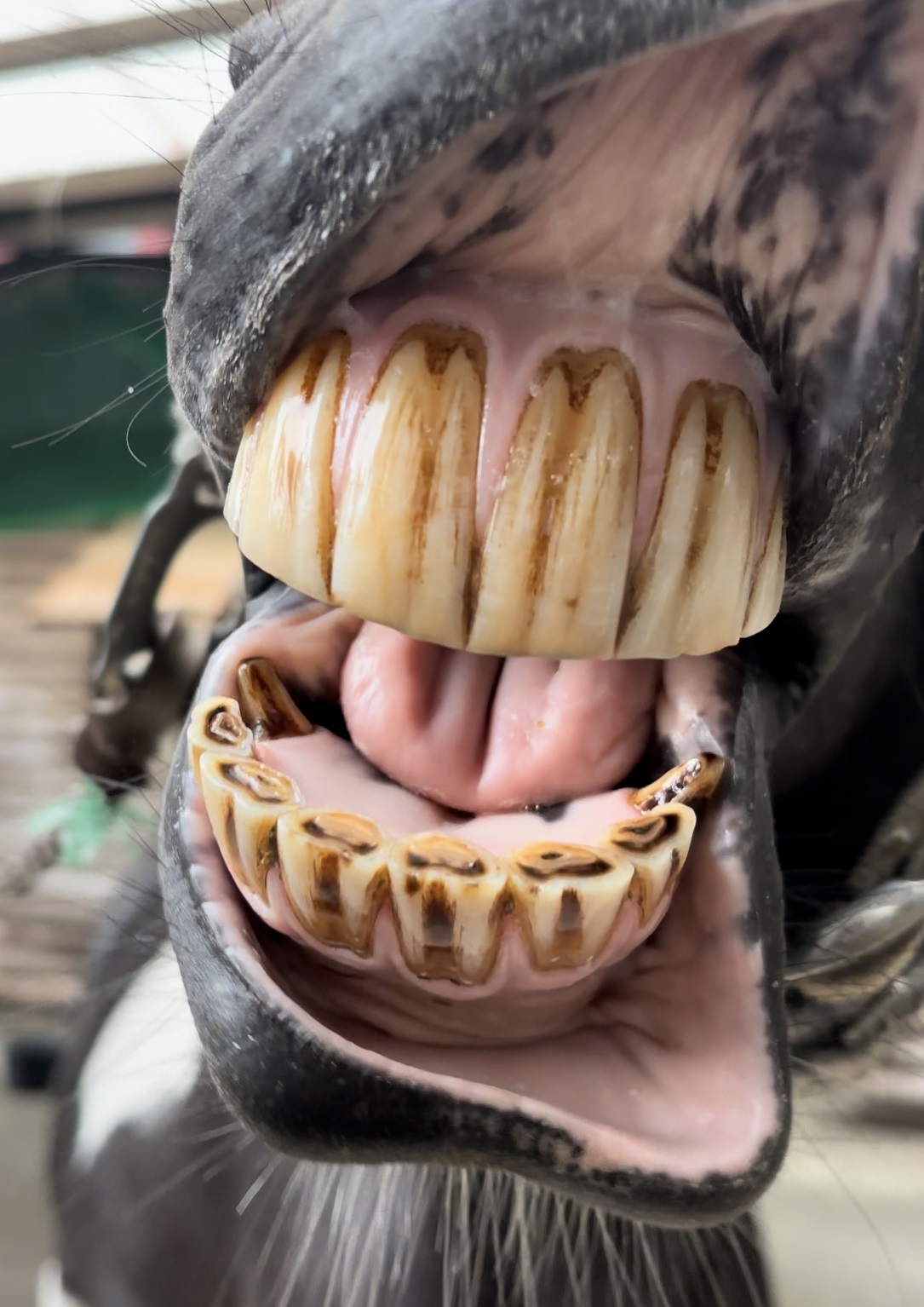馬の歯は上下の歯をすりつぶすことで草を飲み込むことが出来るのですが、その際に歯も擦れていきます。擦れていくと黒い部分の変色が変わっていきます。そのため、その馬が何歳なのかがだいたい予測できちゃうんです!