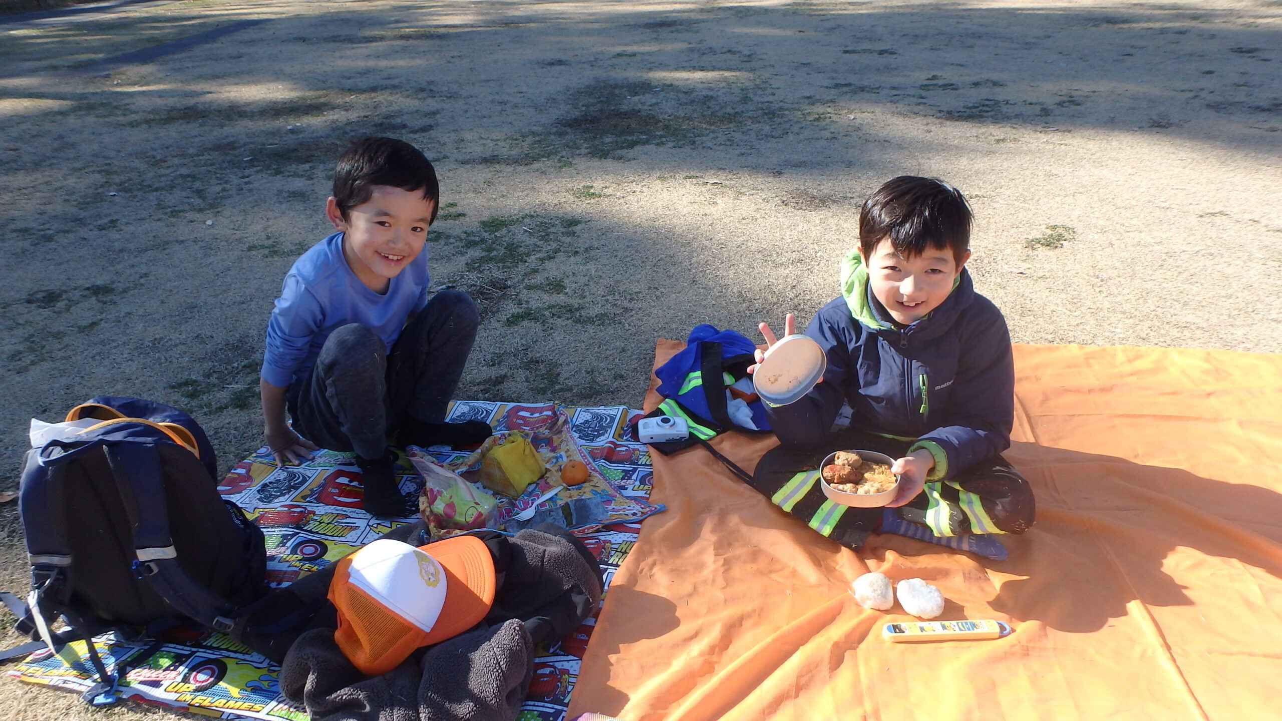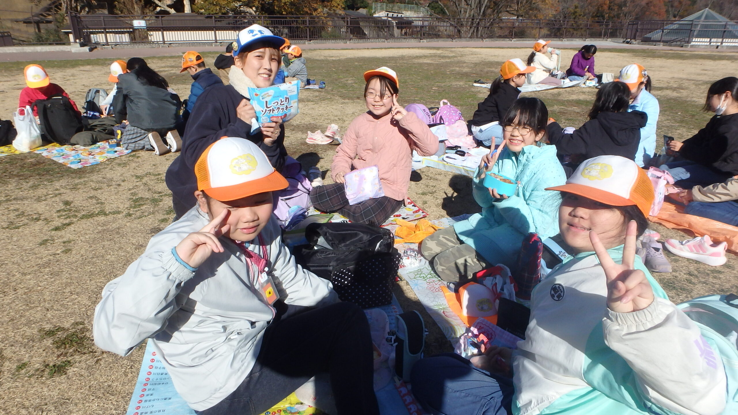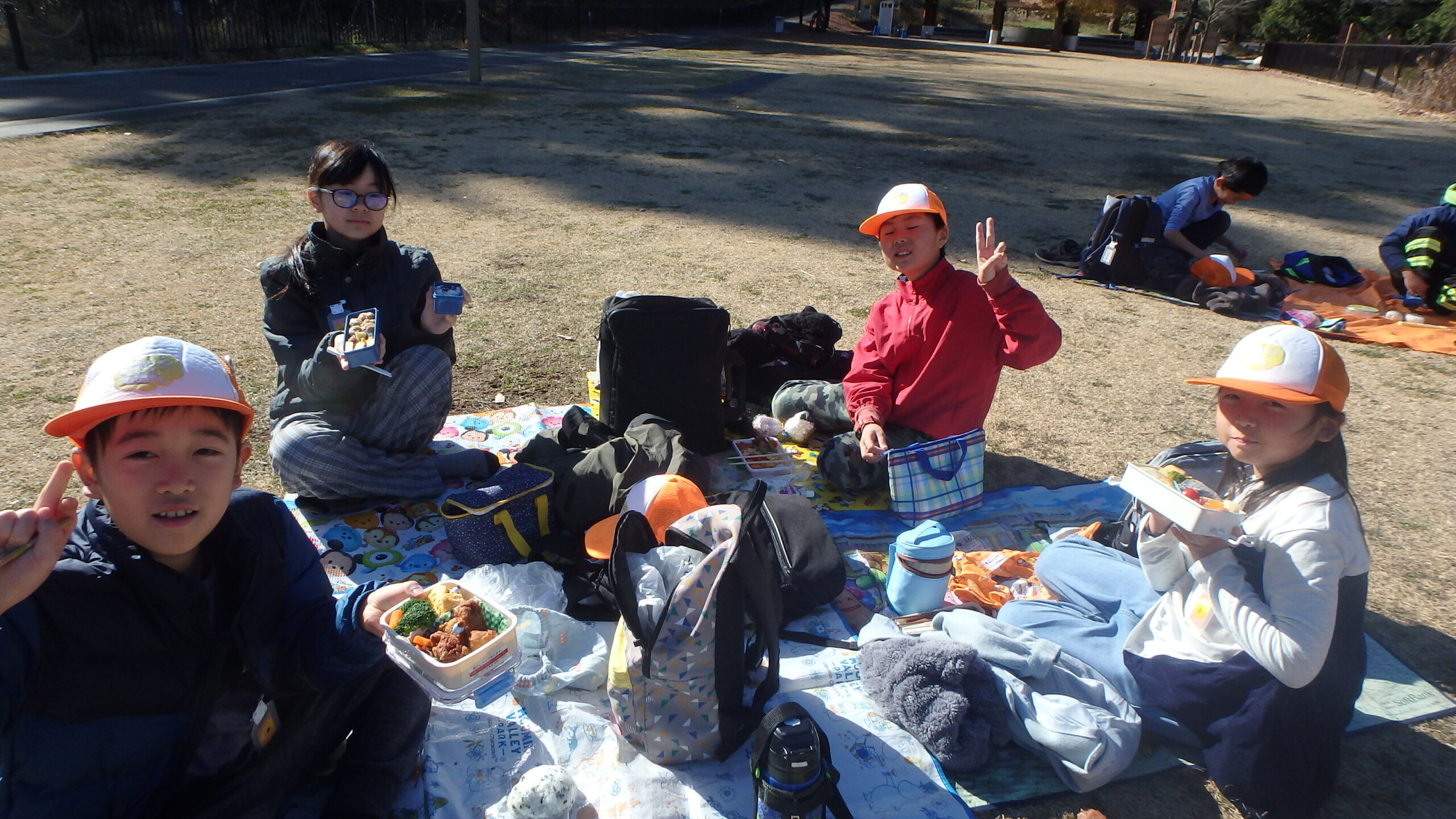 途中のお昼休憩では、レジャーシートを組み合わせてそれぞれ島を作ってお弁当を食べ、お菓子交換も…