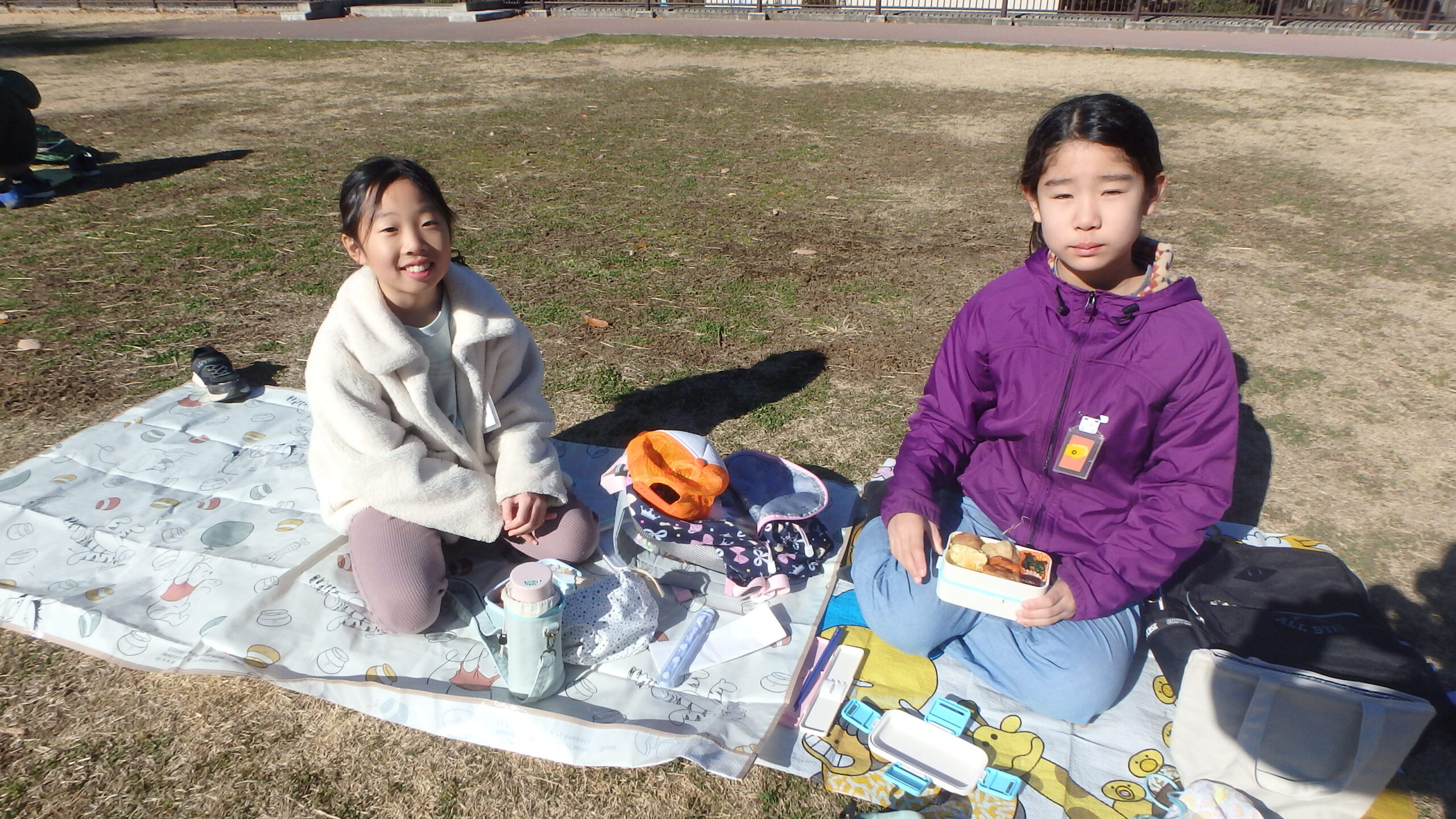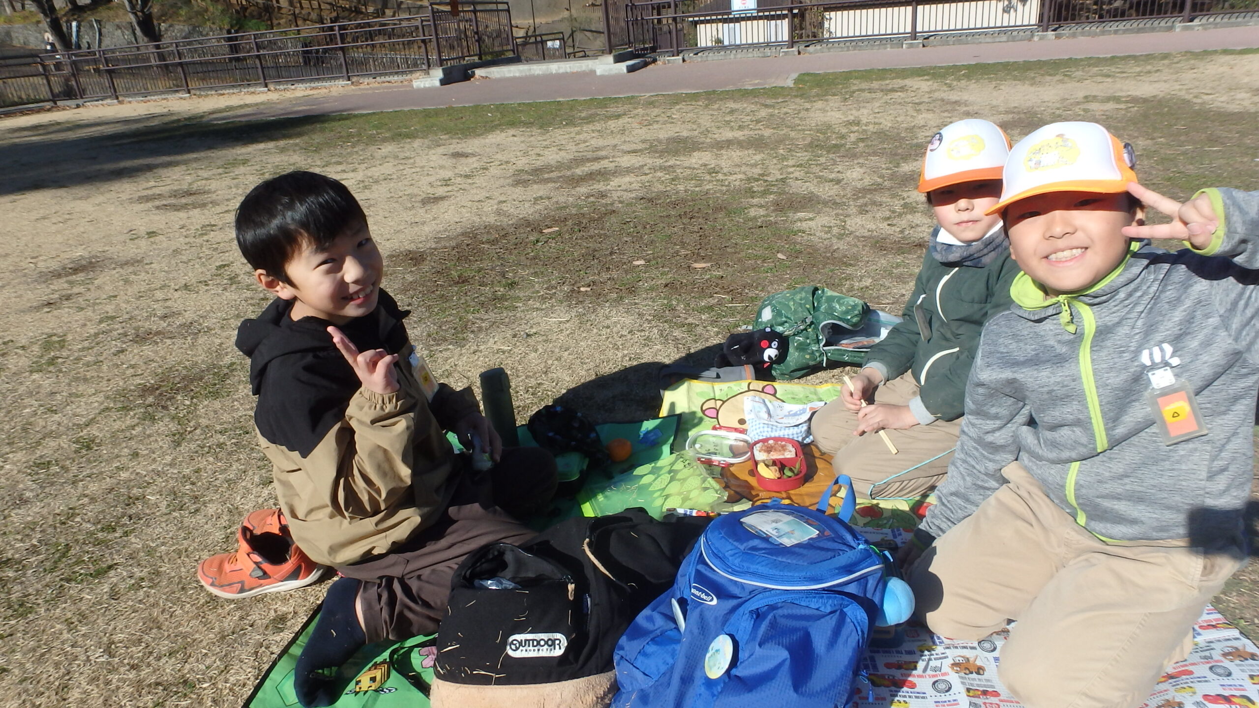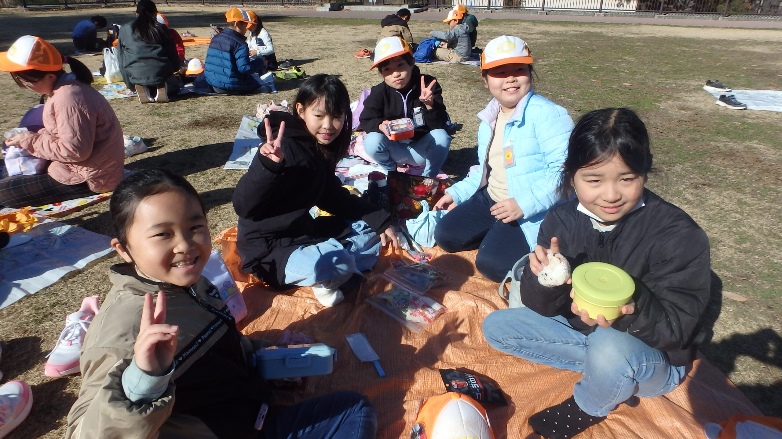 途中のお昼休憩では、レジャーシートを組み合わせてそれぞれ島を作ってお弁当を食べ、お菓子交換も…
