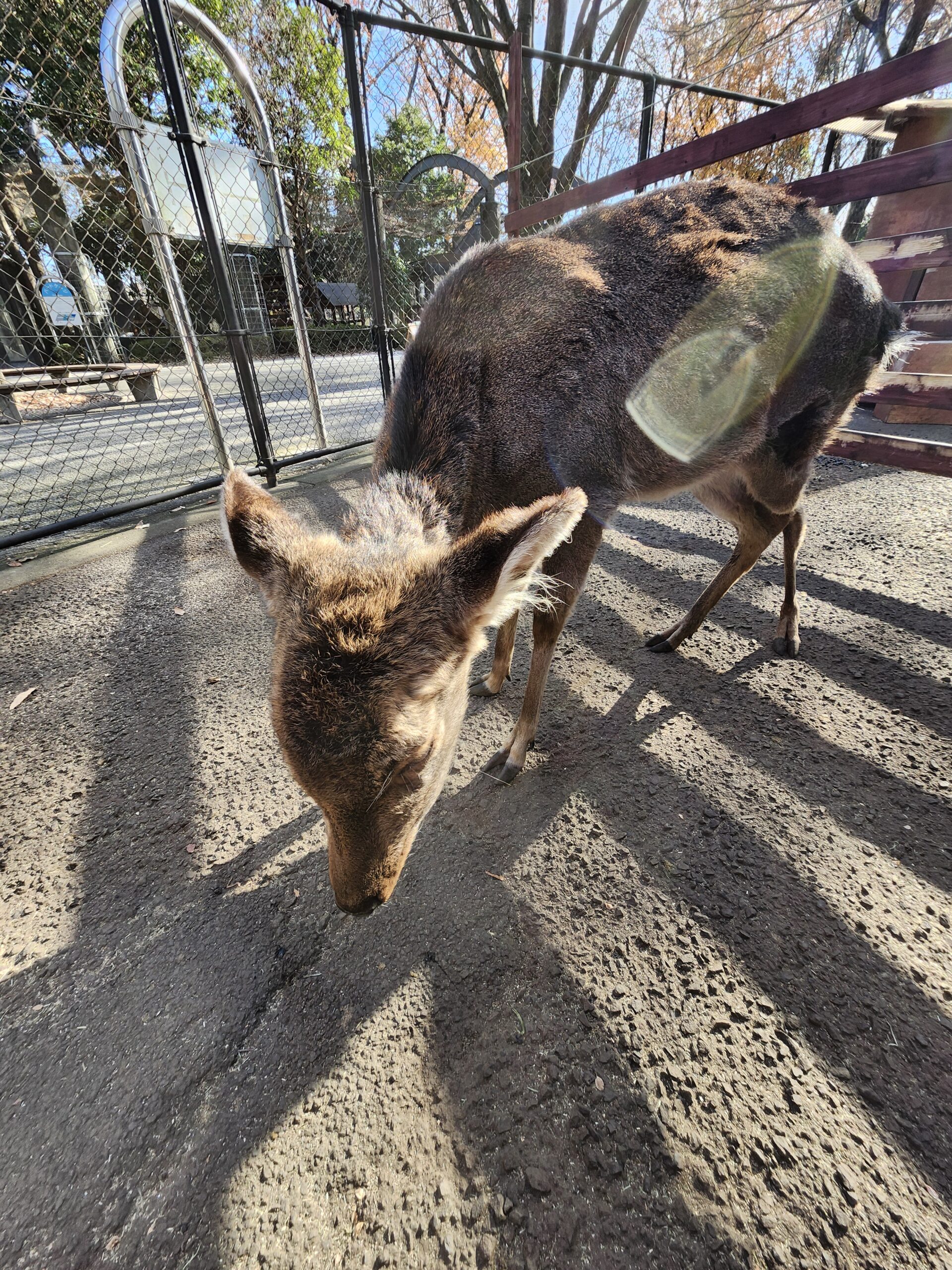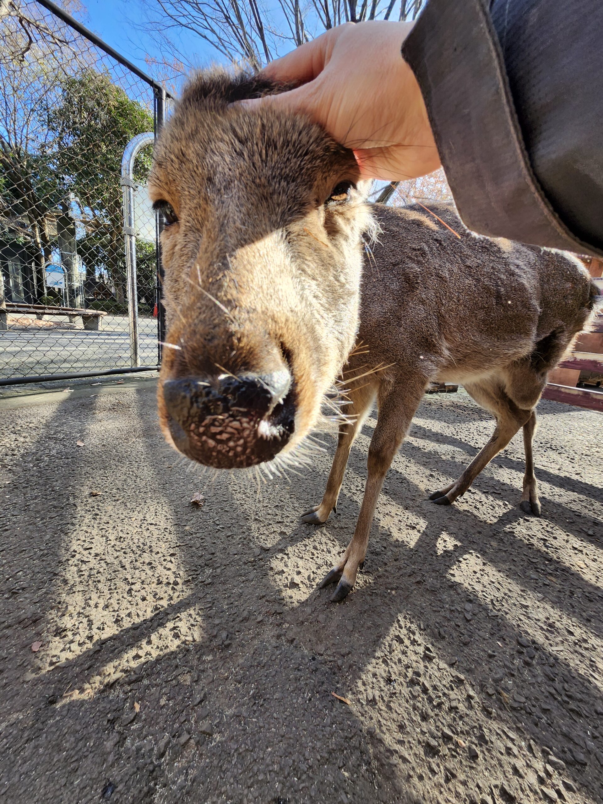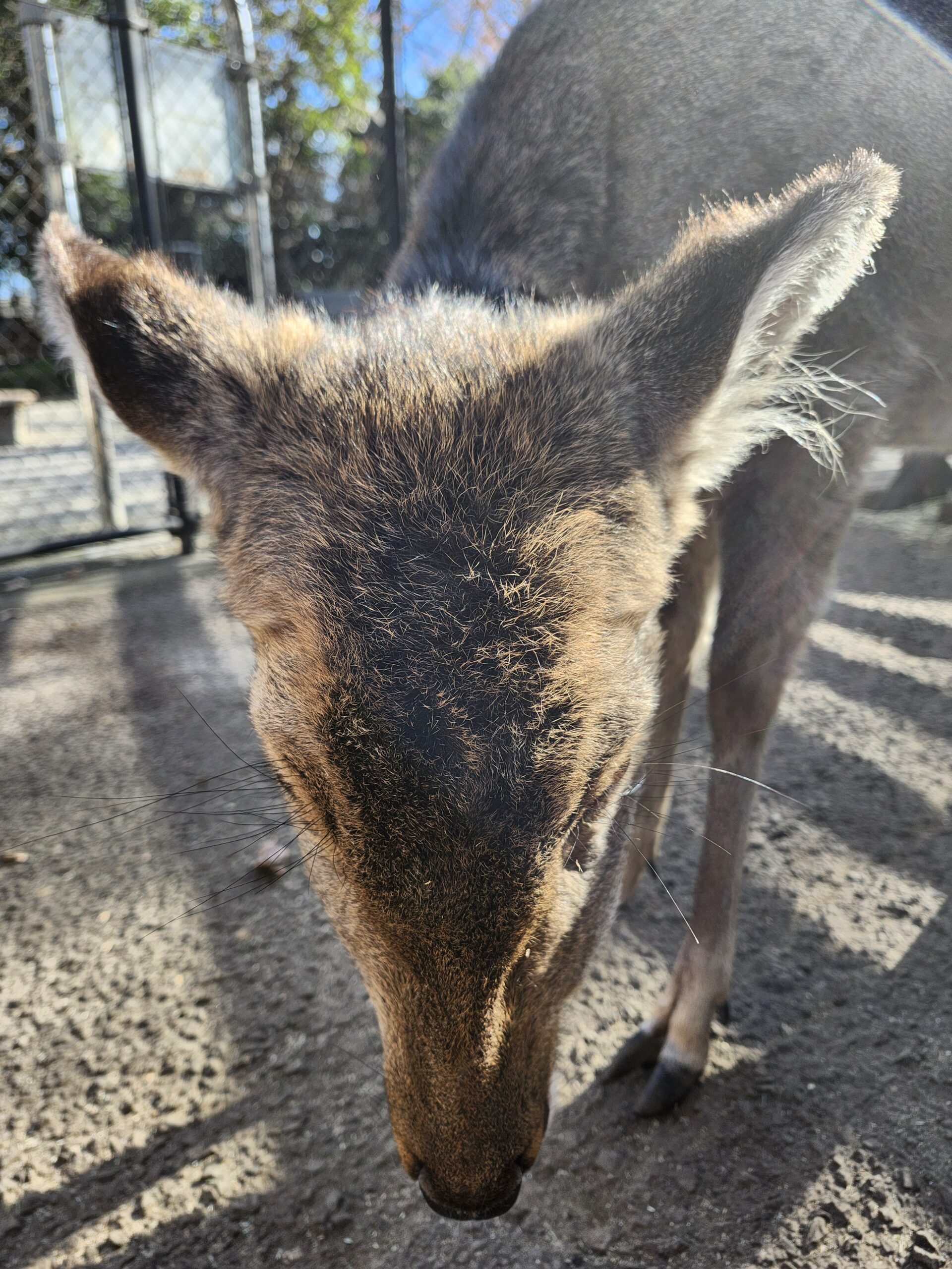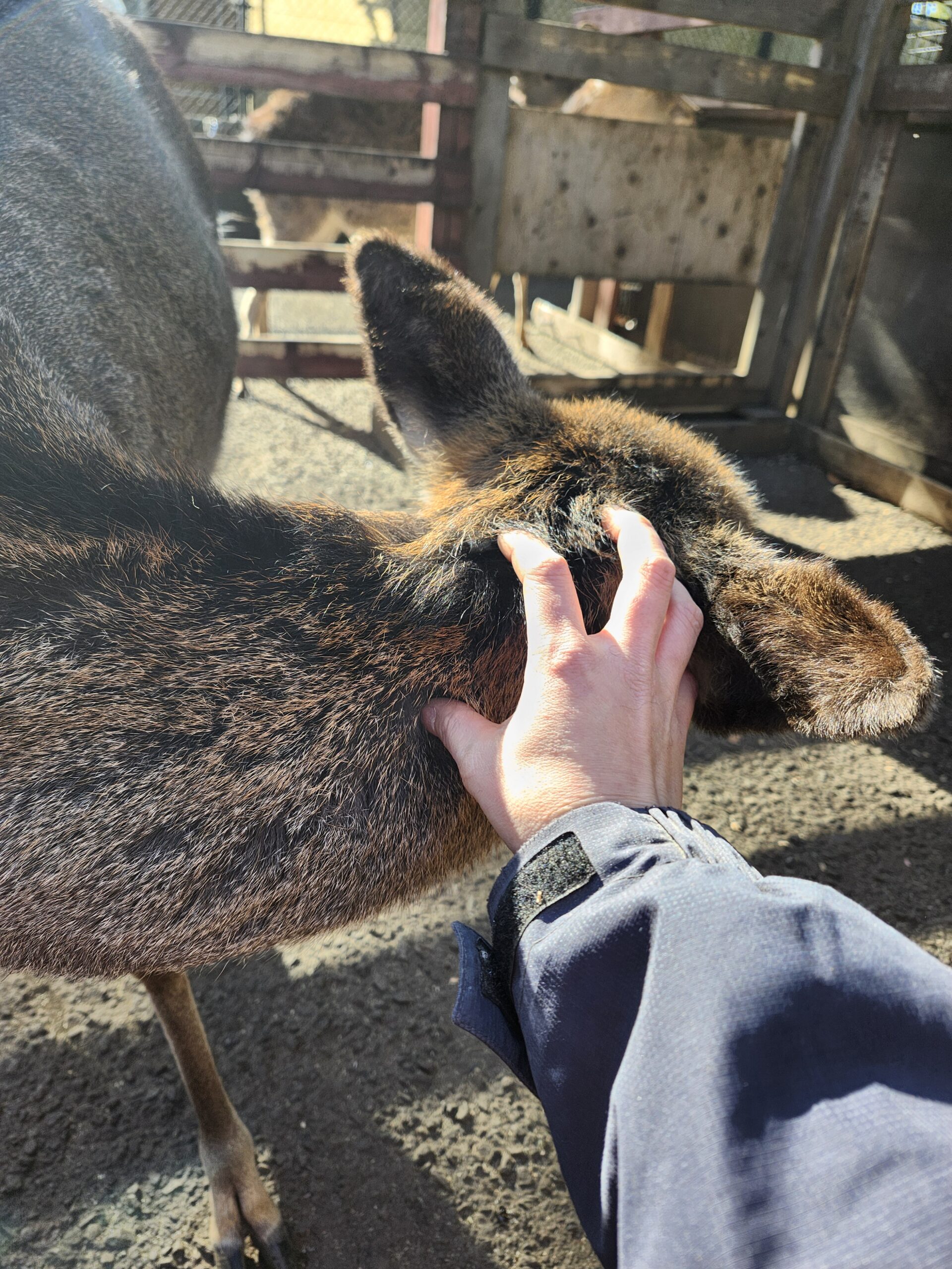 ホンシュウジカのこももちゃんは、こうめちゃんこゆずちゃんよりも3年早く広場で暮らしているので人馴れしており、頭が痒いとこのようにスタッフに掻いてほしくて後ろで待っているのです。