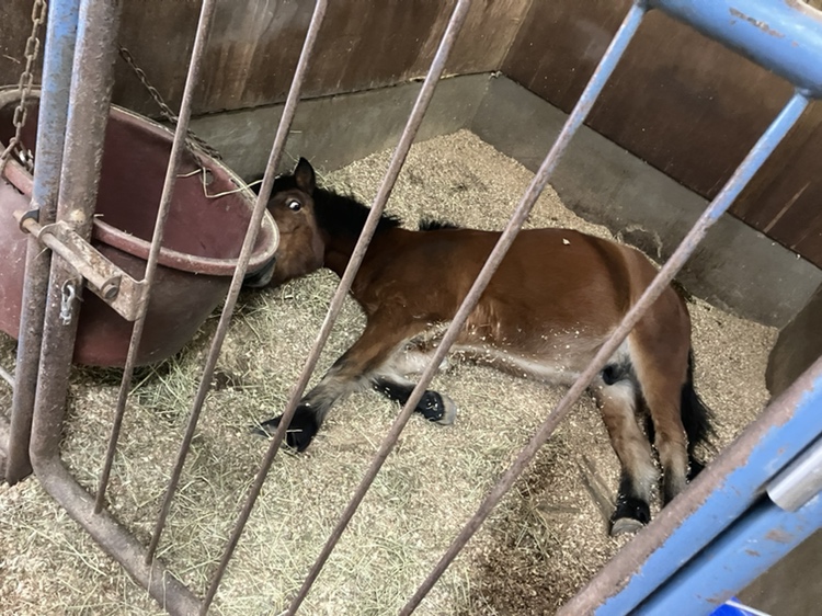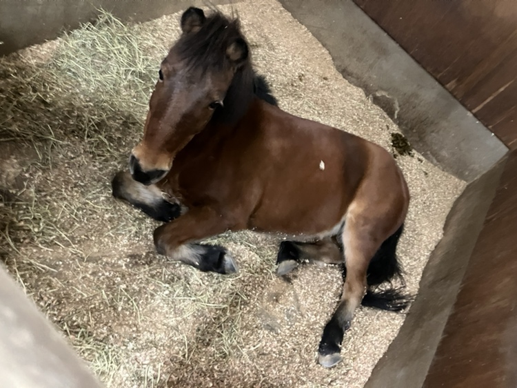 このあと、座ったままお顔の近くにあるご飯(乾草)をもぐもぐと食べていました