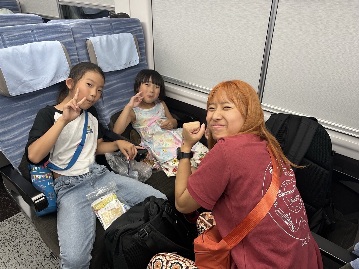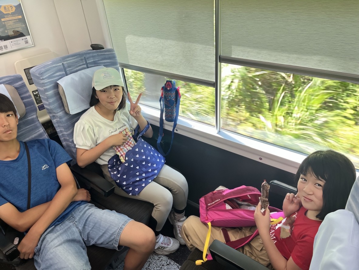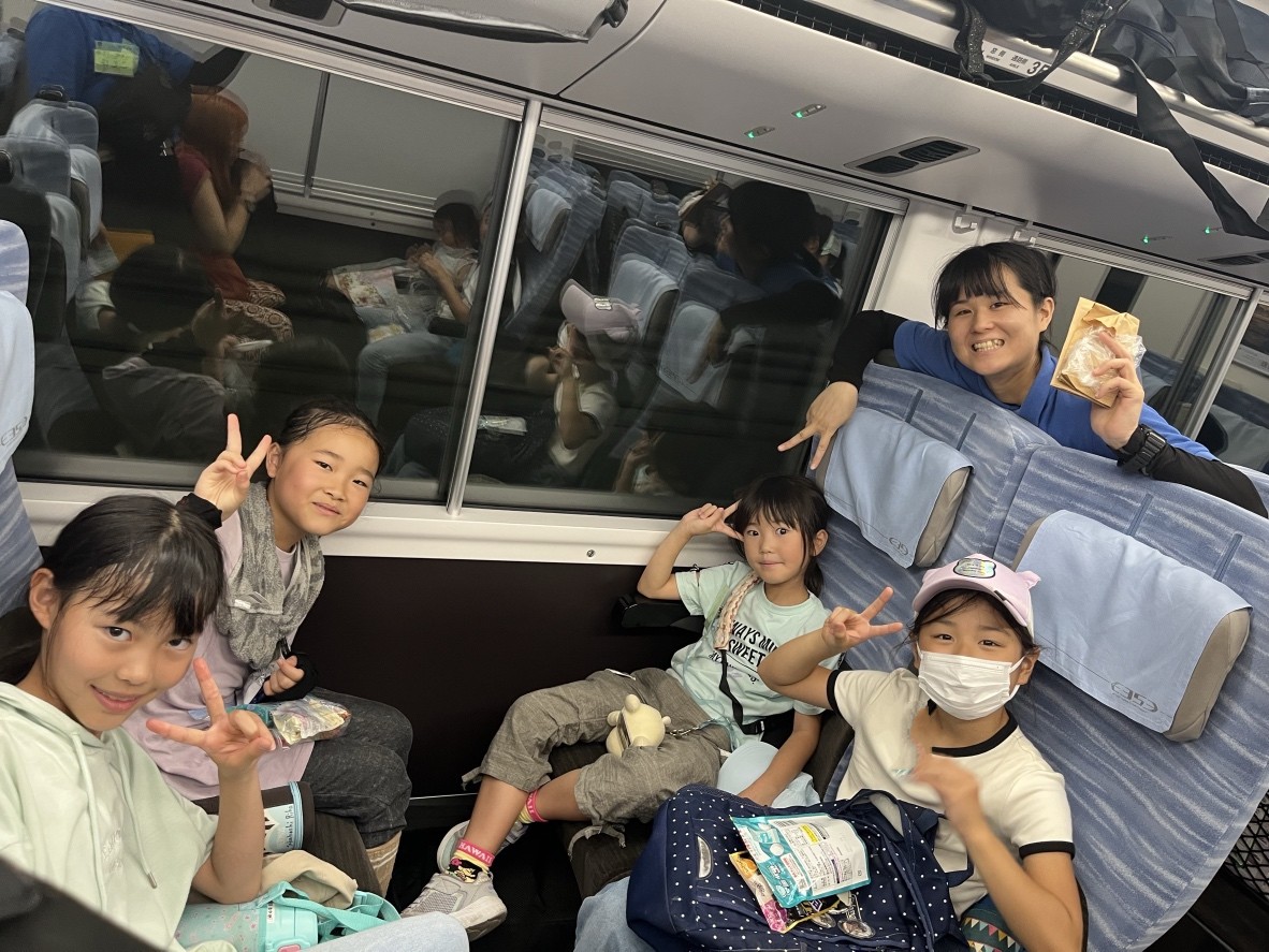 保護者の皆さんに「行ってきまーす!」の挨拶をしたあと、あずさの中では持参したおやつを交換する子やカードゲームで遊ぶ子など思い思いの過ごし方をしていました。