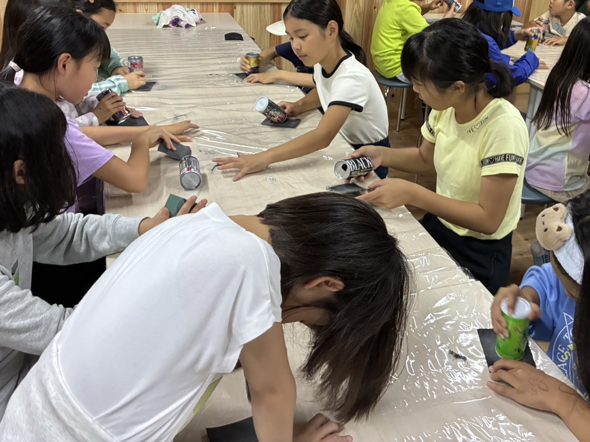 空き缶を削って、本体にシールなどでデコレーションをしてペン立てに