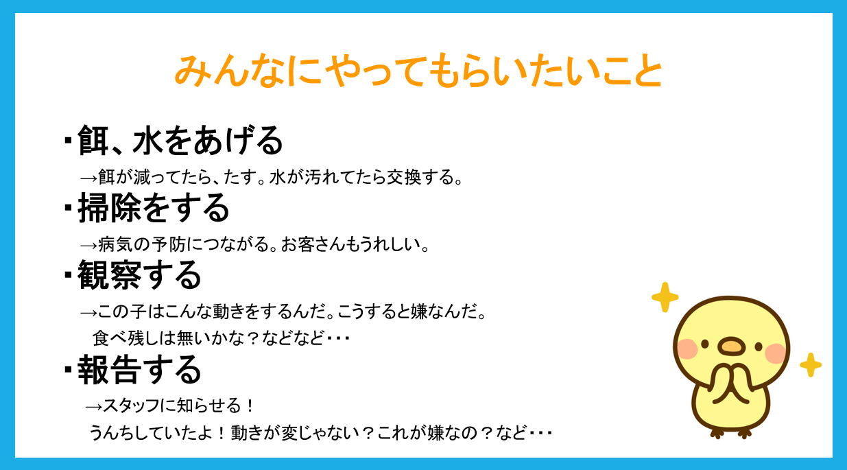 話の中で出てきた『観察』。動物のお世話をするうえで、違和感や疑問を大事にしてほしい。その違和感や疑問が動物の健康に関わるかもしれないから、スタッフに報告してね。とめぐもふからのお願い。