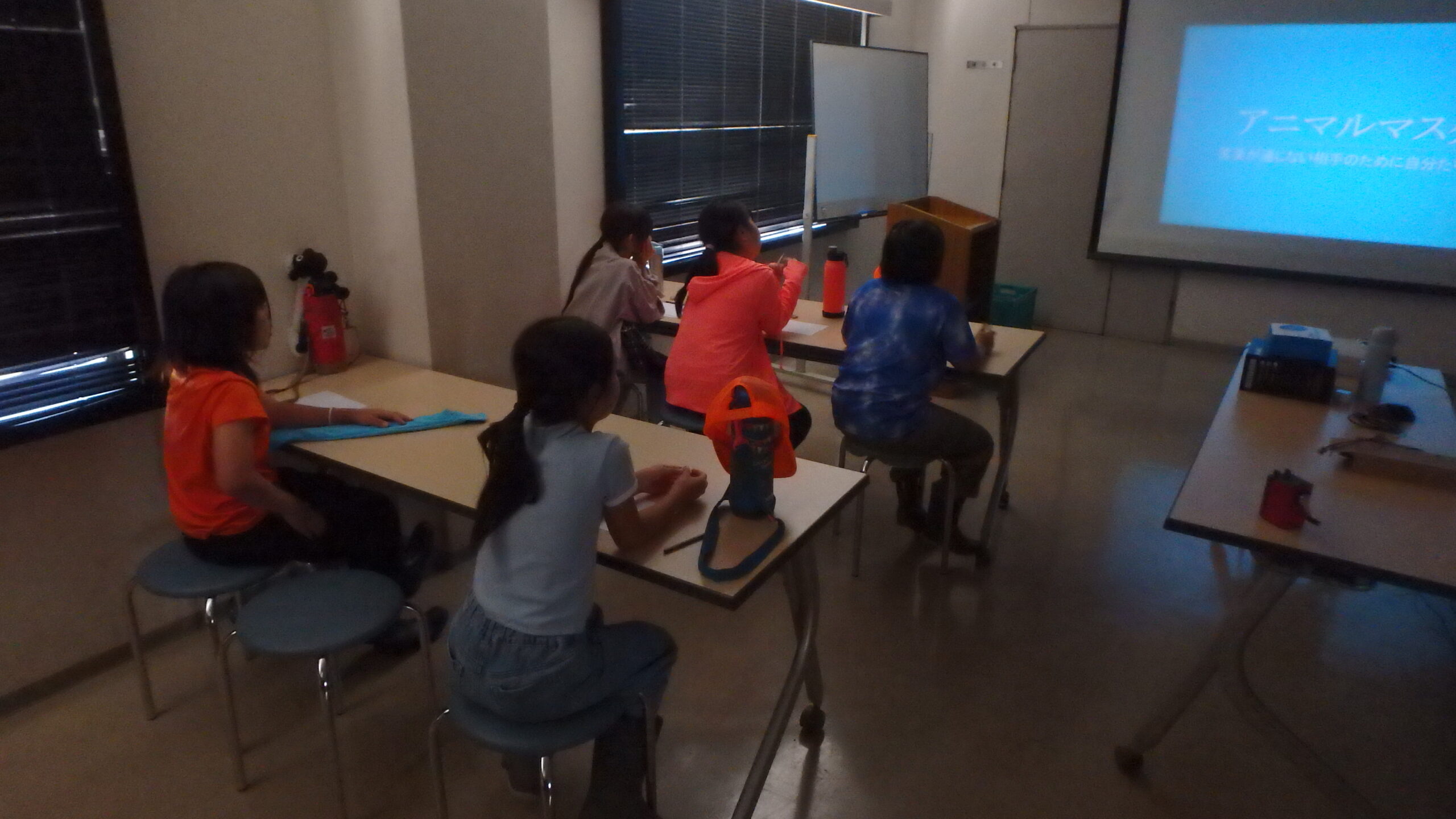 お腹いっぱいの午後・・・薄暗い中始まった、めぐもふによる「動物クラブってなぁんだ?」「動物のお世話って何するの?」「動物クラブのみんなに協力してもらいたいこと」など真面目なお話。眠くなっちゃうだろうな。と思っていましたが、みんなメモをしながら真剣に聞いてくれていてめぐもふ大感激でした