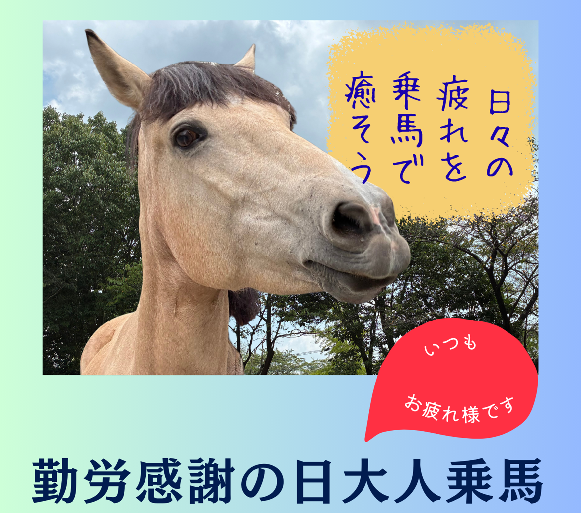 皆様、日々のお仕事や家事、学業などに追われ、お疲れではないですか? そんな皆様に、馬に癒されていただくべく、勤労感謝の日大人乗馬を行います! 大きなポニーの背に揺られ、日々の疲れを癒しましょう!🐴 ポニーを見に来るだけでも大歓迎です!ぜひお越しください🐴 🥕日時:11月23日(日)13:30~14:30 🥕対象:一人乗り…中学生以上の方 二人乗り…2歳から小3までのお子様と、中学生以上の方の2名 🥕場所:引馬乗馬場横の大きなグラウンド🐎 🥕料金:500円(乗り場で現金精算)