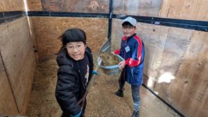 最終日も朝起きたら、まずは馬に餌をあげにいきます!初めは怖がっていた子も、少し慣れて1人であげられるように
