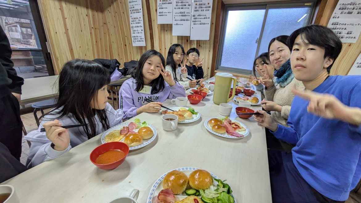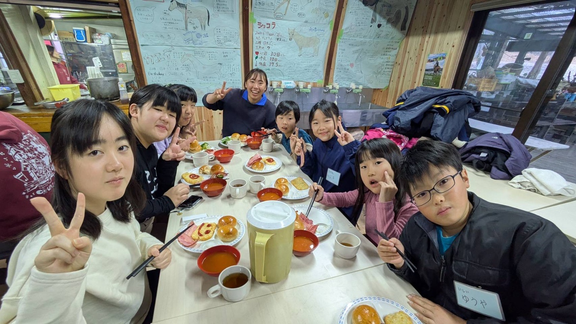 馬に餌をあげた後は、自分たちも朝ごはんをモリモリと食べました