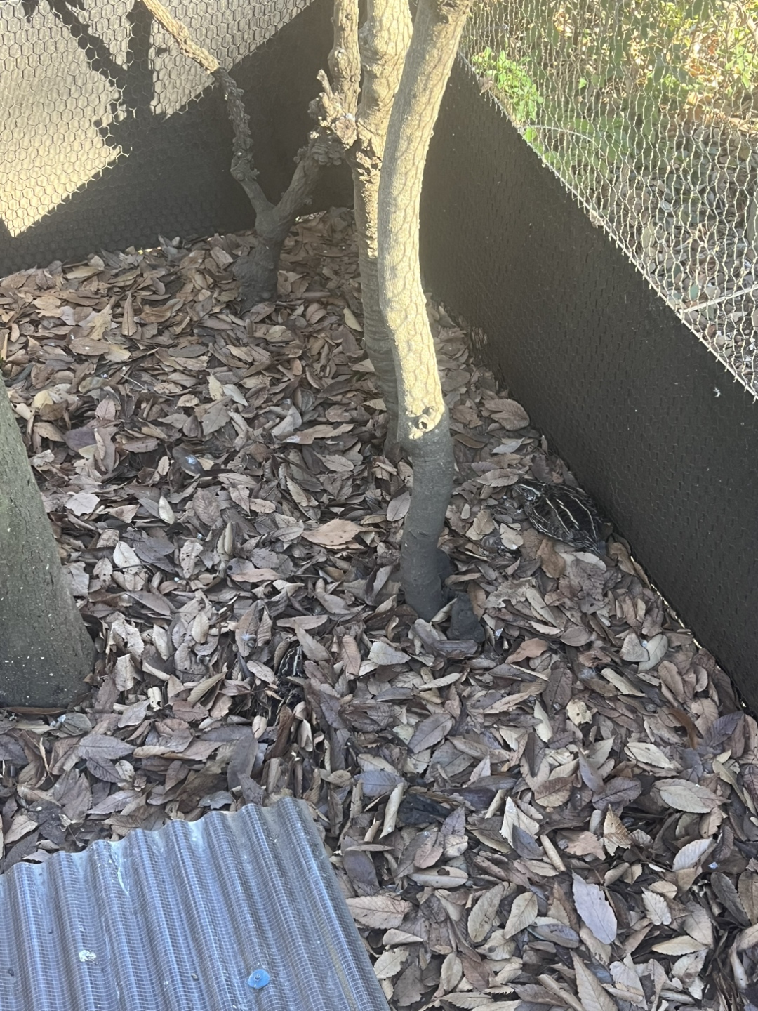 バードケージでは冬で気温も下がり、少しでも暖をとれるように落ち葉を敷いています。